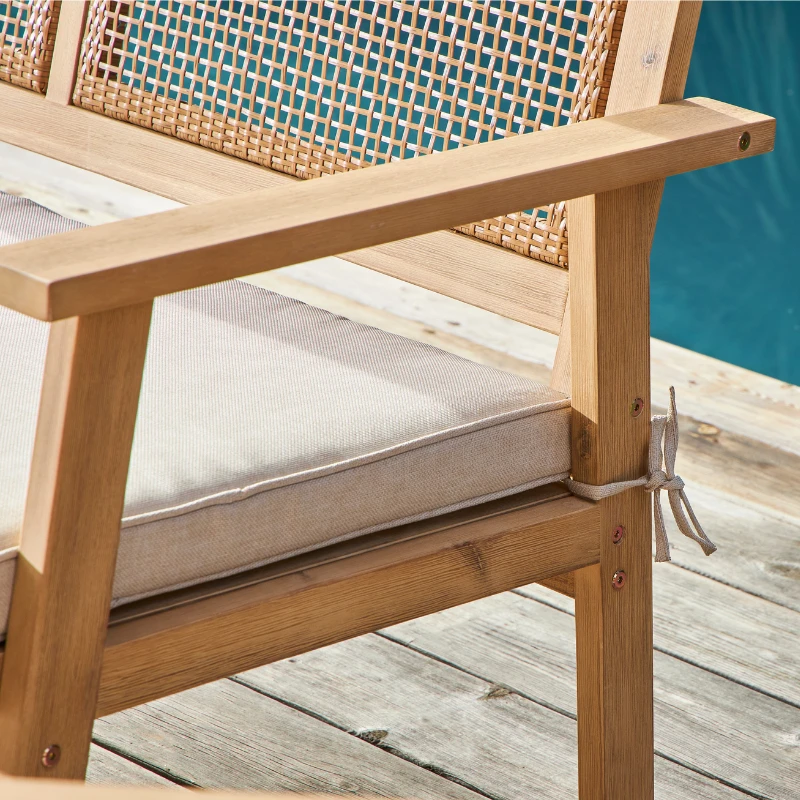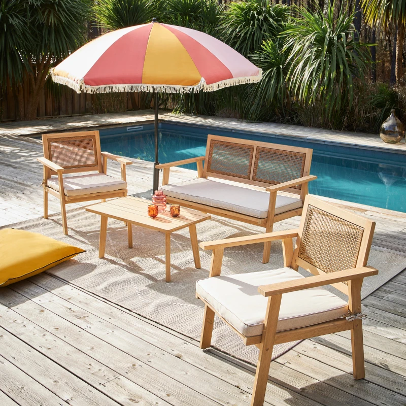 L’aspect retro du cannage et la touche moderne des coussins beiges font de ce salon de jardin un magnifique intemporel !