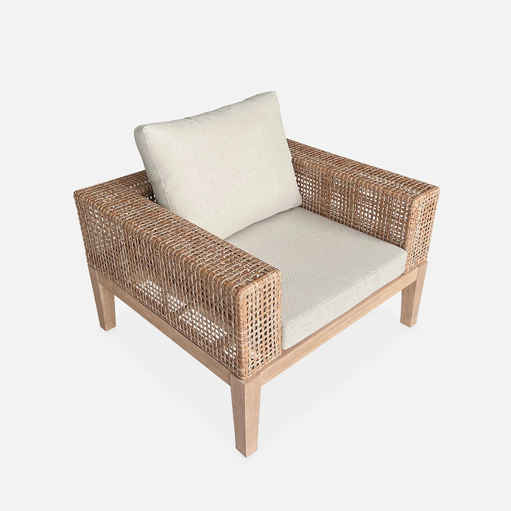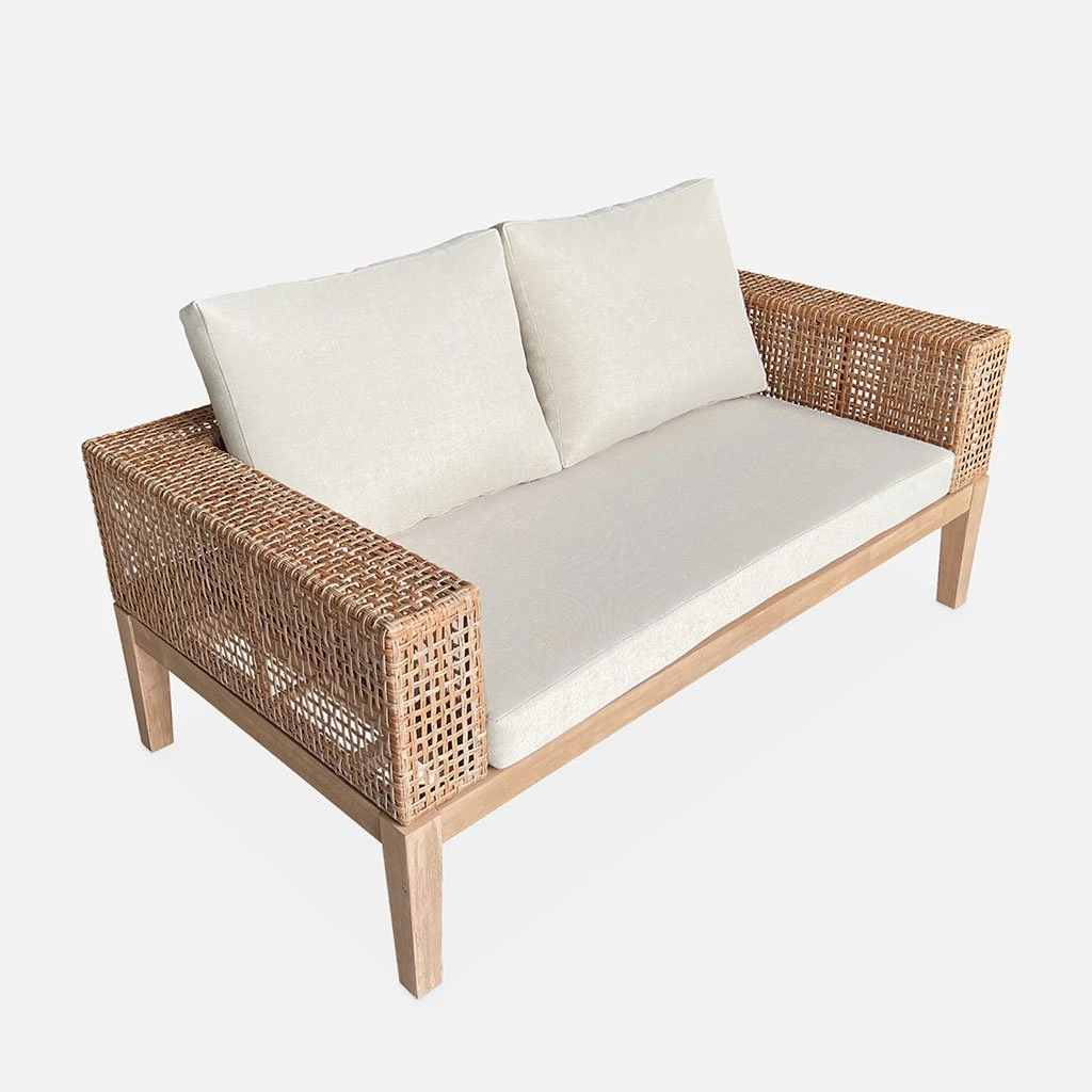 Venez découvrir notre Salon de jardin olinda 4 places en cannage et acacia brossé et coussins beige de la marque Alice Garden à découvrir sur Fabrique de Styles.