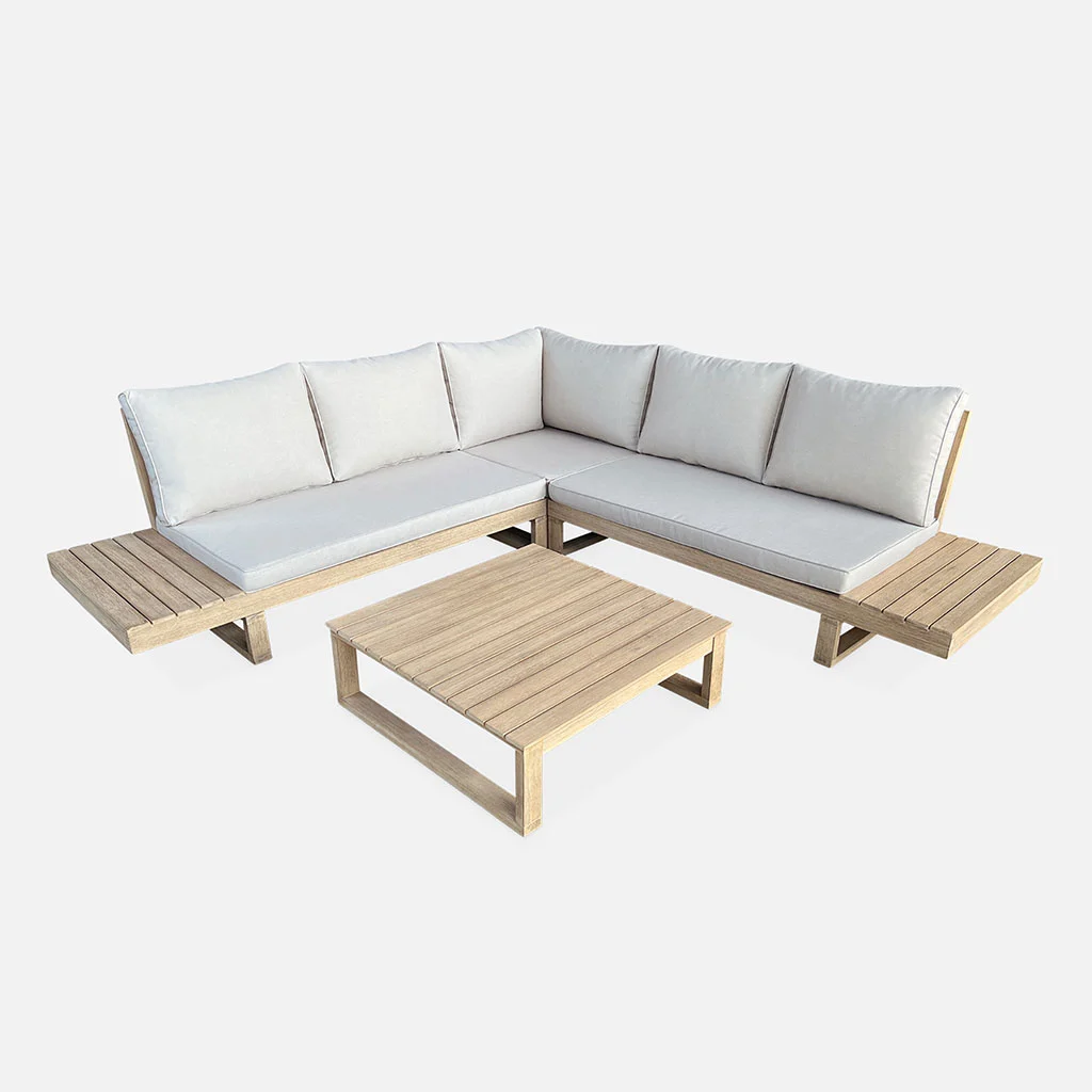 Une table basse assortie au salon accompagne également l’ensemble pour passer un moment convivial en extérieur.