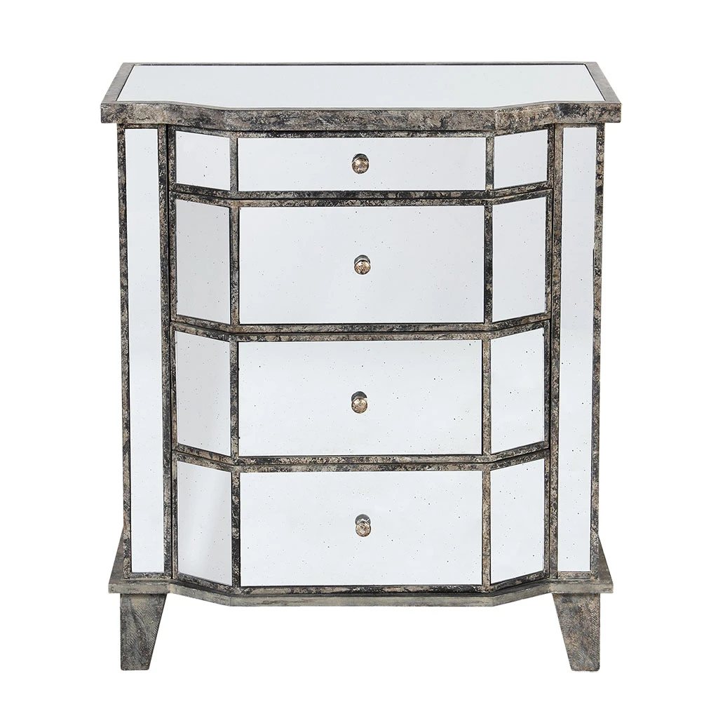 Voici un meuble incontournable du style classique chic : la commode en bois miroir. Elle est ici proposée patinée, comme vieillie, sublimée par le temps qui passe.