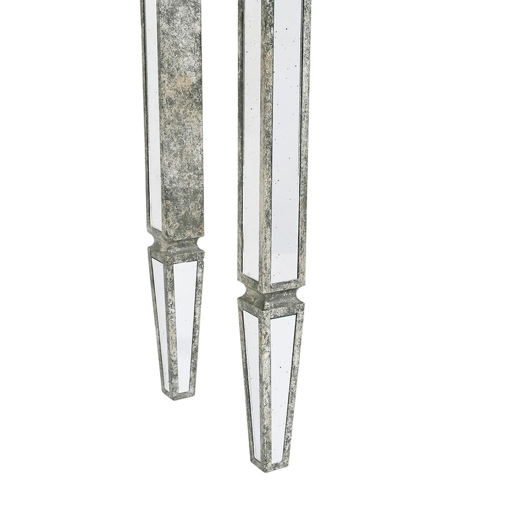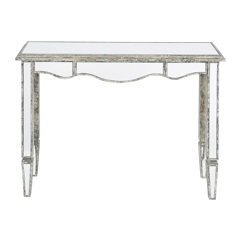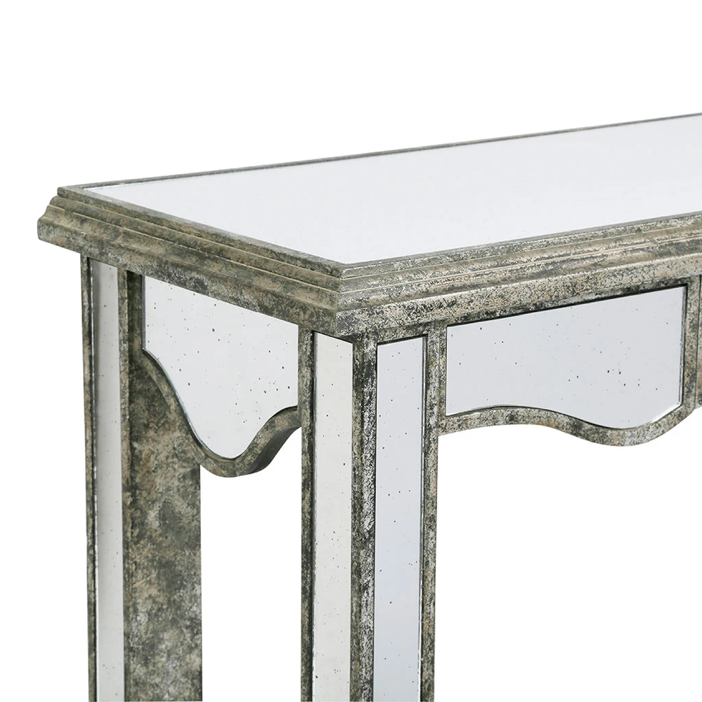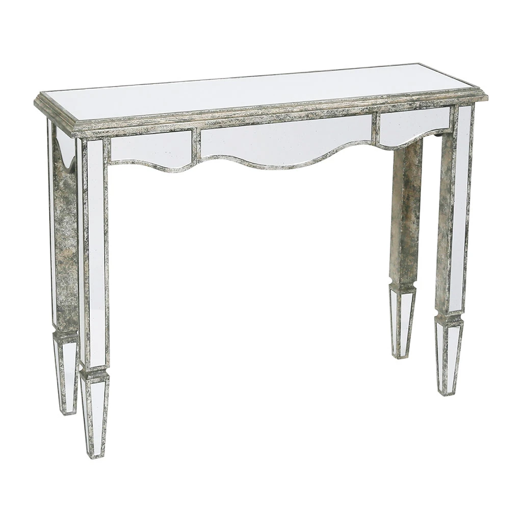 Cette console marie le bois patiné et le verre pour offrir un meuble au style résolument vénitien. Ce mélange de matières appelé le bois miroir trouvera parfaitement sa place dans une maison ou un appartement à la déco classique chic.