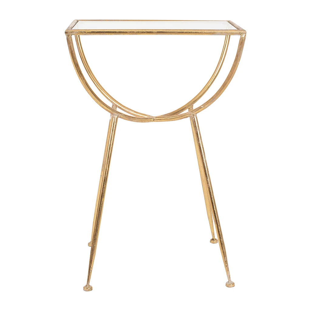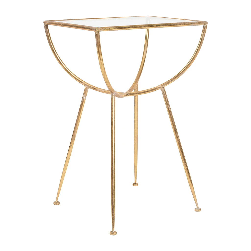 La table d’appoint Eluminea est une table chic carré de style industriel en fer doré avec un plateau en verre.