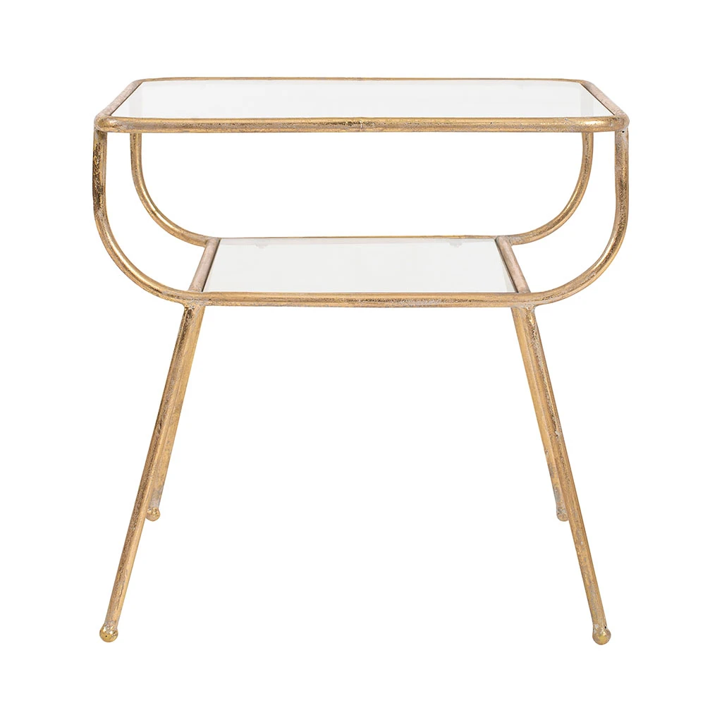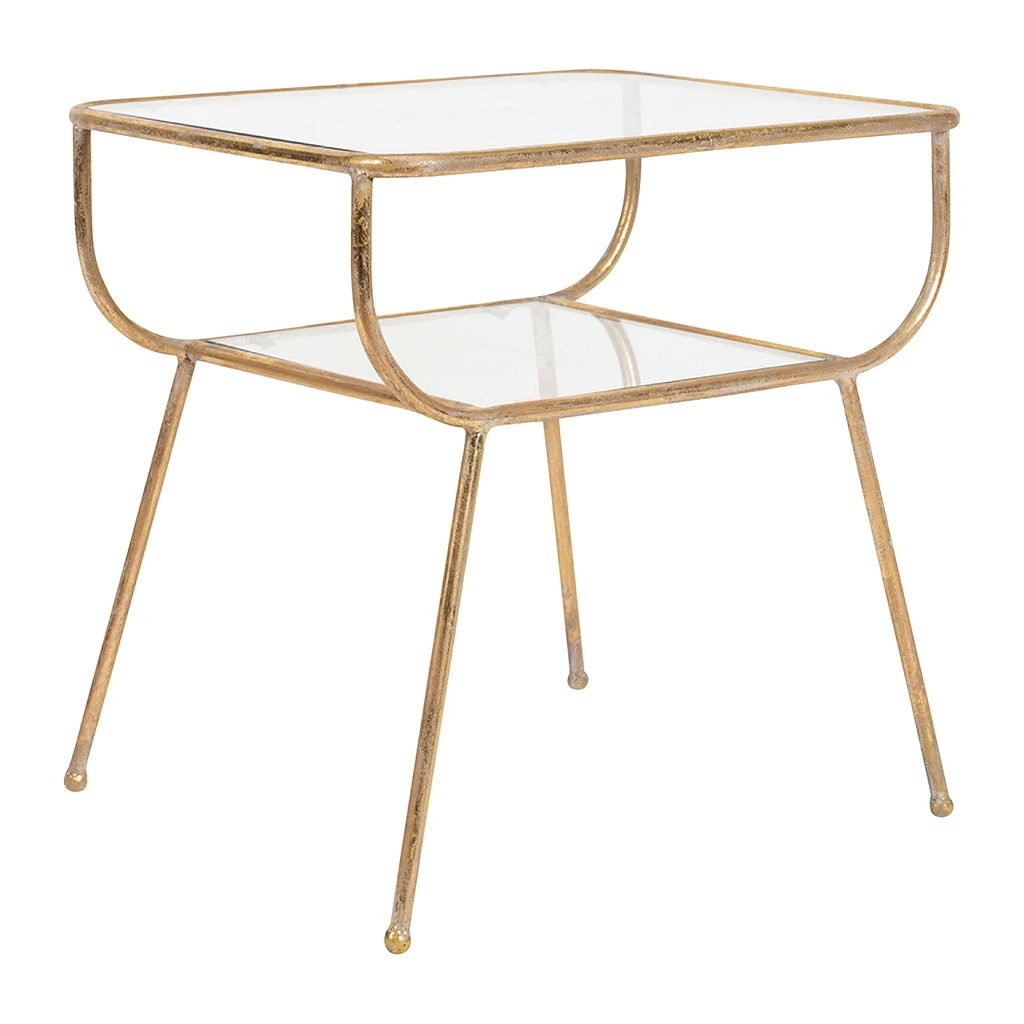 La table d’appoint Eluminea de style industriel en fer doré avec un plateau en verre et la pièce tendnace qu’il vous faut.
