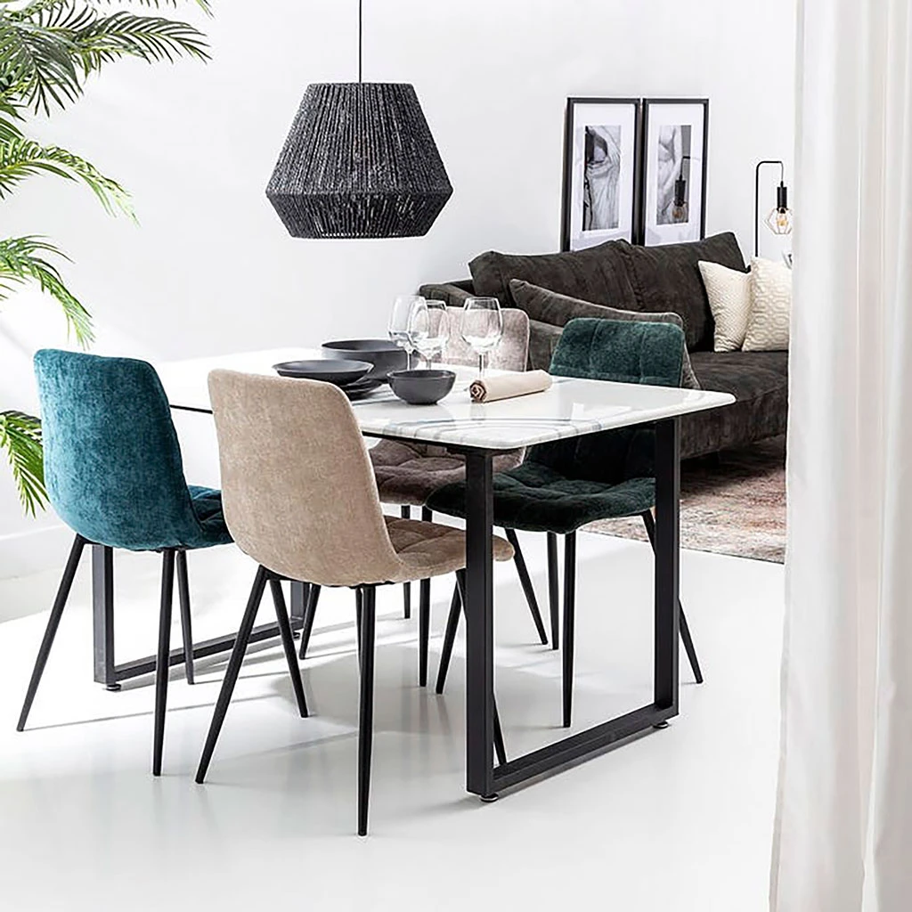 La gamme Mony est un indispensable de la tendance scandinave. Épurée et confortable, elle prendra place à votre table avec élégance. Matière en velours (100 % polyester) et pieds en métal noir. Rembourrage en mousse, de densité 23-25kg/m3.