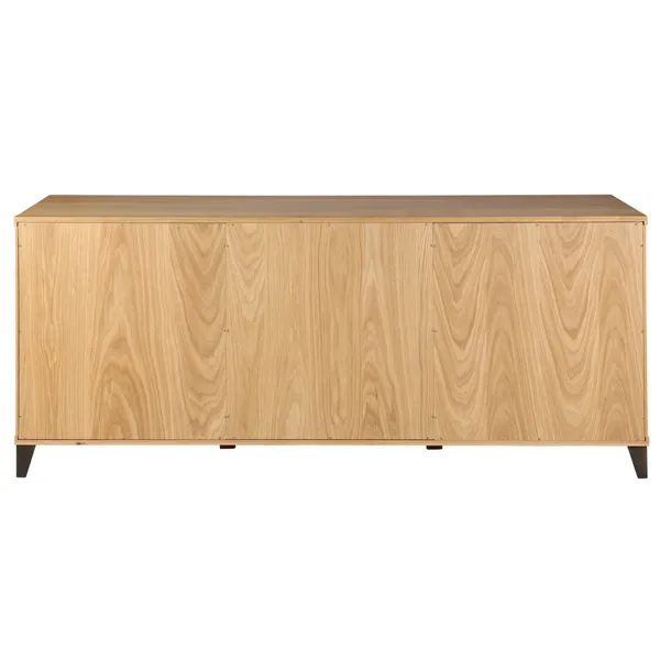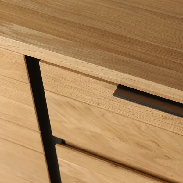 Caisson, portes et tiroirs : chêne massif, vernis nitrocellulosique Etagères : MDF placage chêne, vernis nitrocellulosique Pieds et barres de maintien : acier, peinture à l’huile, brossage à la main